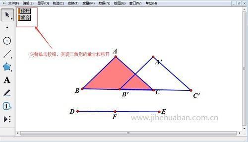 4.單擊平移按鈕,得到一個與原三角形全等的三角形A'B'C'。拖動點F,可以看到兩個三角形位置發生變化。當F與D點重合時,兩三角形也重合。