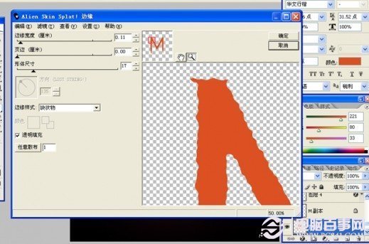 3、選擇文字工具。輸入你要的文字,把邊緣扭曲化。(這里我用的是外掛濾鏡來扭曲,如果沒有安裝濾鏡可以選擇波紋效果來處理)