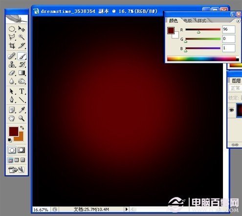 1、新建一個600 *600像素的文檔,背景填充黑色。2、選擇漸變工具,拉一個深紅和黑色的徑向漸變。