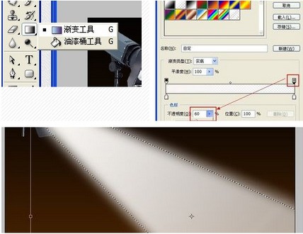 6.選擇“工具欄”中的“漸變填充”工具,進行“白色”填充,同時將漸變條一側的透明度設置為“60%”,然后在選區內拖動進行填充。接著按“Ctrl+T”對選區進行變換,效果如圖: