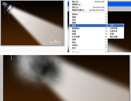 7.接下來,為投影燈增加一些煙霧效果。新建一圖層,選擇“工具欄”中的“套索”工具,在投影爛肆燈附近創建一選區,并設置羽化半徑為“30”。采用默認背景色和前景色,然后執行“濾鏡”→“渲染”→“云彩”。