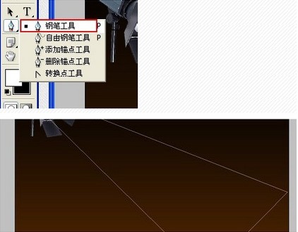 4.新建一圖層,選擇“工具欄”中的“鋼筆工具”,在舞臺繪制一個燈光投影路徑形狀。