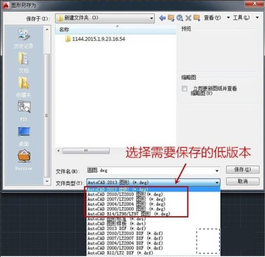 選擇版本保存時,要注意是圖形文件還是別的,圖形文件是*.dwg。