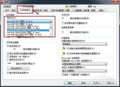 5.在選項命令框中,找到“打開和保存”,在文件保存另存為里選擇我們需要轉換的低版本文件的版本類型。這里演示我們選擇cad2010的*.dwg,然后點擊確定。