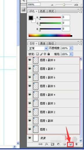 3、然后在圖層面板,拖動圖層1到下方的創建新圖層按鈕來復制圖層數。這里一共復制了9個。