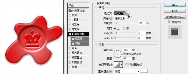 3、雙擊圖層,調(diào)出圖層屬性,設(shè)置【斜面和浮雕】,數(shù)值如下圖。