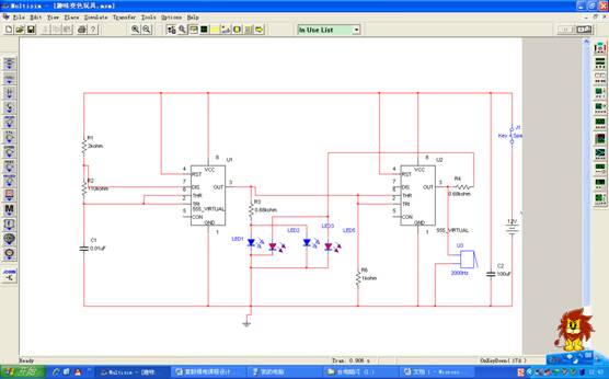 通過555芯片得到多諧振蕩電路,產(chǎn)生的振蕩波形驅(qū)動蜂鳴器發(fā)出聲音。兩塊555時基電路構(gòu)成的電子變色閃光器,可以使發(fā)光管時而發(fā)紅光,時而發(fā)藍光。合上開關(guān)S后電路即起振,輸出端out腳就交替輸出高電平與低電平,右邊555時基電路的作用是作為反相器。在輸出端接兩個發(fā)光二極管,在振蕩波形的驅(qū)動下發(fā)出閃爍的光芒。同時,由于管芯的接法不同及發(fā)光管在空間的不同排列位置就可以形成絢麗多彩的視覺效果。整個電路聲光并舉,實現(xiàn)了原本的實驗要求。