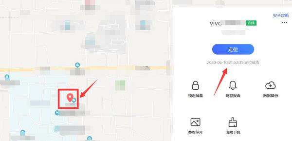 查看定位結(jié)果定位完成后,左側(cè)地圖會(huì)顯示手機(jī)實(shí)時(shí)位置,右側(cè)提供“鎖定屏幕”“響警報(bào)音”“數(shù)據(jù)備份”“查看照片”“清除數(shù)據(jù)”等操作選項(xiàng)。
