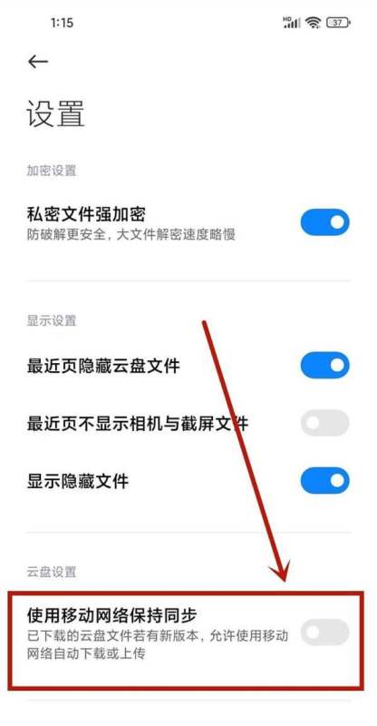 第四步:關(guān)閉移動網(wǎng)絡(luò)同步在設(shè)置頁面中,找到與云盤同步相關(guān)的選項(如“使用移動數(shù)據(jù)同步”或類似表述),將其開關(guān)調(diào)整為關(guān)閉狀態(tài)。