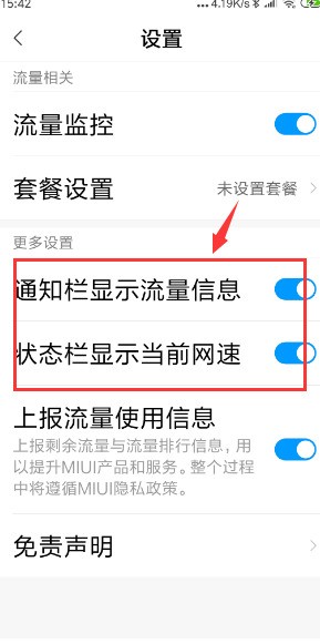 4、緊接著找到“通知欄顯示流量信息,狀態欄顯示當前網速”的選項,讓它們全部打開。
