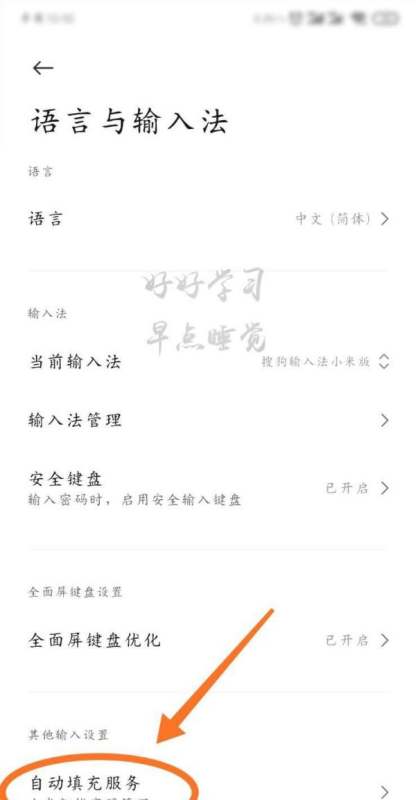 進(jìn)入自動(dòng)填充服務(wù)選擇界面在輸入設(shè)置界面中找到“自動(dòng)填充服務(wù)”選項(xiàng),點(diǎn)擊進(jìn)入選擇界面。