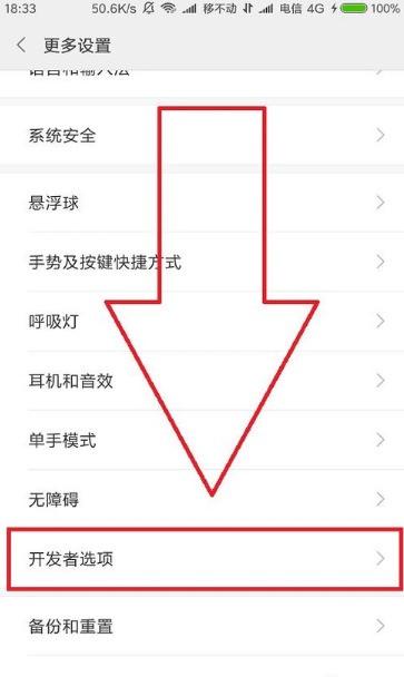 9.進(jìn)入更多設(shè)置后,在選擇頁面最下方倒數(shù)第三個(gè)選擇框中就是“開發(fā)者選項(xiàng)”,點(diǎn)擊并進(jìn)入。