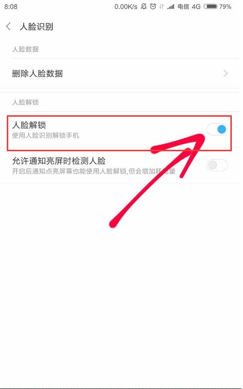 五、最后將“人臉解鎖”一欄的開關(guān)開啟即可,如圖。