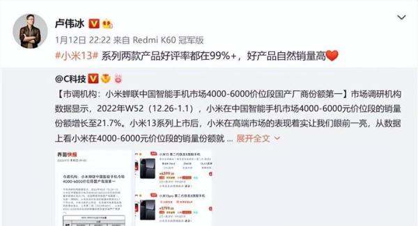 小米13系列兩款機型的好評率都超過99%,延續了12S系列和MIX Fold 2上市后的良好口碑。