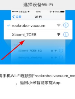 6、提示將手機(jī)連接到機(jī)器人,在“設(shè)置-無線局域網(wǎng)”中選擇機(jī)器人(以rockrobo-vacuum開始),待連接機(jī)器人成功(出現(xiàn)對(duì)勾)后,切回到米家APP,將開始和機(jī)器進(jìn)行連接。如圖所示: