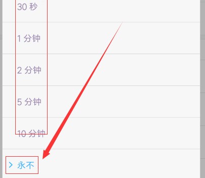 4、這個(gè)自動(dòng)鎖屏的時(shí)間間隔或者叫作頻率就可以設(shè)置了,想要手機(jī)一直亮著選擇永不就可以了,這樣手機(jī)永遠(yuǎn)都不會(huì)自動(dòng)鎖屏。