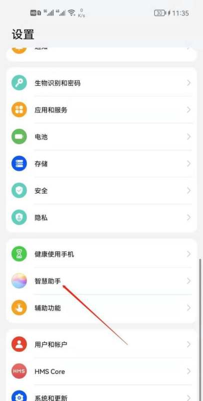 進入智慧助手功能模塊在設置菜單中滑動查找“智慧助手”選項,點擊進入該功能頁面。
