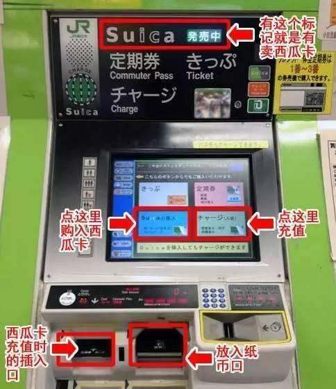 購買西瓜卡非常簡單,只需在有JR線的車站找到帶有Suica標識的綠色自動售票機,按照屏幕提示選擇“Suicaの購入”(購買西瓜卡),然后選擇購買金額并放入錢款,即可拿到西瓜卡。需要注意的是,購買金額內含500日元押金,這將在退卡時退還。