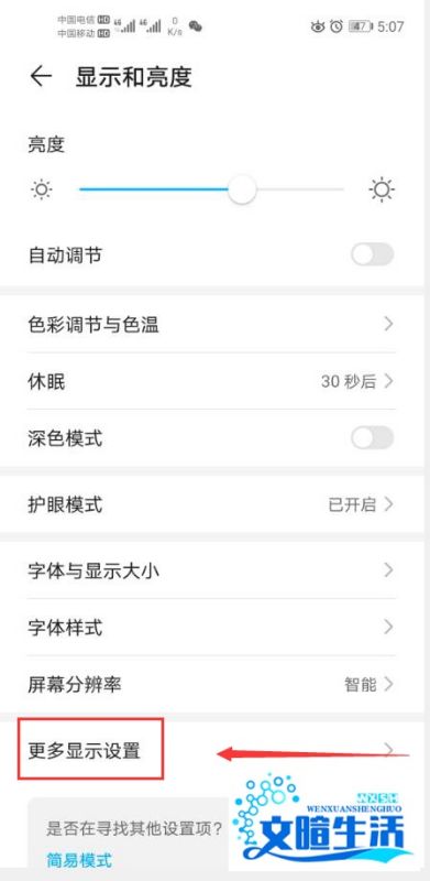 選擇更多顯示設置在“顯示和亮度”界面中,向下滑動至底部或查找“更多顯示設置”入口,點擊進入后將顯示更多細分顯示選項。