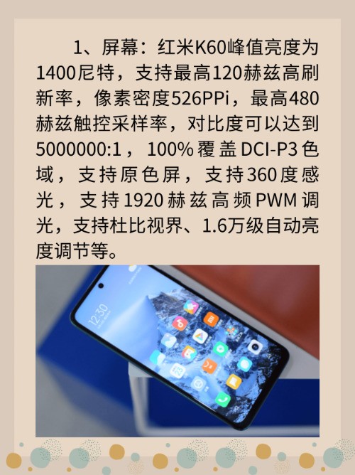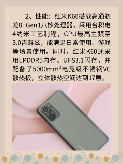 1、屏幕:紅米K60峰值亮度為1400尼特,支持最高120赫茲高刷新率,像素密度526PPi,最高480赫茲觸控采樣率,對(duì)比度可以達(dá)到5000000:1,100%覆蓋DCI-P3色域,支持原色屏,支持360度感光,支持1920赫茲高頻PWM調(diào)光,支持杜比視界、1.6萬(wàn)級(jí)自動(dòng)亮度調(diào)節(jié)等。2、性能:紅米K60搭載高通驍龍8+Gen1八核處理器,采用臺(tái)積電4納米工藝制程,CPU最高主頻至3.0吉赫茲,能滿足日常使用、游戲等場(chǎng)景使用。同時(shí),紅米K60還采用LPDDR5內(nèi)存、UFS3.1閃存,并配備了5000mm電競(jìng)級(jí)不銹鋼VC散熱板,立體散熱空間達(dá)到17層。