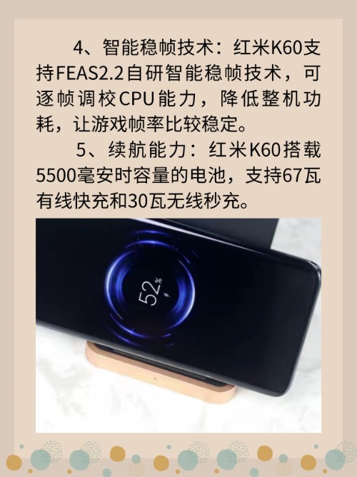 4、智能穩(wěn)幀技術(shù):紅米K60支持FEAS2.2自研智能穩(wěn)幀技術(shù),可逐幀調(diào)校CPU能力,降低整機(jī)功耗,讓游戲幀率比較穩(wěn)定。