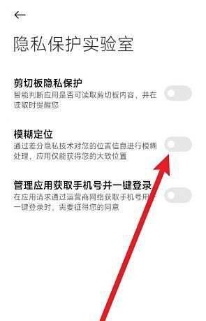 開(kāi)啟模糊定位:在隱私保護(hù)實(shí)驗(yàn)室頁(yè)面中,找到模糊定位選項(xiàng),點(diǎn)擊右側(cè)開(kāi)關(guān)按鈕將其開(kāi)啟。開(kāi)啟后,系統(tǒng)會(huì)向應(yīng)用提供近似位置信息,而非精確坐標(biāo),從而保護(hù)用戶(hù)隱私。