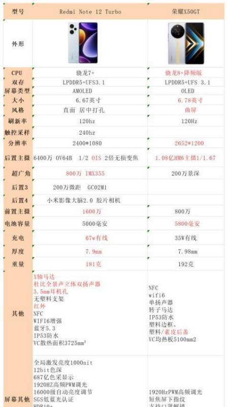 (注:以上圖片為紅米Note 12 Turbo和榮耀X50GT的參數(shù)對比圖,僅供參考。)