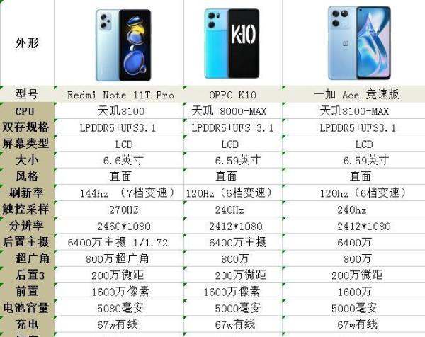 續(xù)航方面:一加ACE競(jìng)速版和OPPO K10都配置了5000毫安電池,而紅米Note 11T Pro則使用了5080毫安電池,比前兩者多出了80毫安容量,續(xù)航表現(xiàn)更出色。