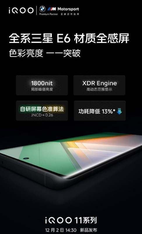 iQOO官方宣布,iQOO 11全系將標配全球首發的2K 144Hz E6全感屏。