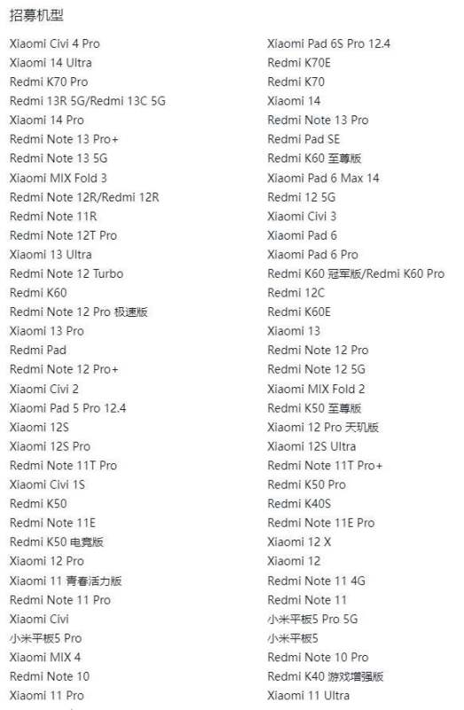 內測招募中機型:部分小米機型已開啟 HyperOS 正式版內測招募,預計后續將逐步推送更新。