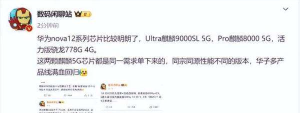 數(shù)碼博主@數(shù)碼閑聊站曝光了華為nova 12 Ultra和nova 12 Pro的相關(guān)信息。據(jù)悉,華為nova 12 Ultra將搭載麒麟9000SL 5G平臺(tái),而nova 12 Pro則搭載麒麟8000 5G平臺(tái)。其中,麒麟9000SL 5G平臺(tái)的CPU主頻約為2.3GHz,而麒麟8000 5G的性能略遜于麒麟9000SL,但其CPU頻率尚未公布。