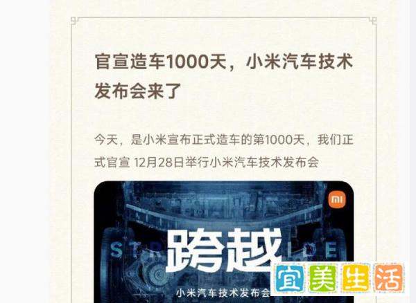 發(fā)布會(huì)時(shí)間:2023年12月25日小米宣布,首款新能源汽車技術(shù)發(fā)布會(huì)定檔于12月28日召開(kāi),這一天恰好是小米官宣“造車”的第1000天。