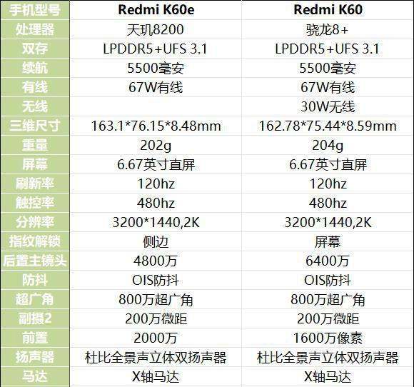 紅米K60e:如果日常只是玩王者、吃雞之類的游戲,看重屏幕和續(xù)航,紅米K60e已經(jīng)足夠滿足需求。其價格相對較低,且大部分配置與紅米K50相同,性價比較高。紅米K60:如果喜歡玩原神之類的大型游戲,對性能有更高要求,或者希望嘗試無線快充、對拍照效果有更高追求,那么紅米K60是更好的選擇。雖然其價格相比紅米K60e高出300元,但考慮到其性能、屏幕、影像等方面的升級,這300元的差價是合理的。五、相同點