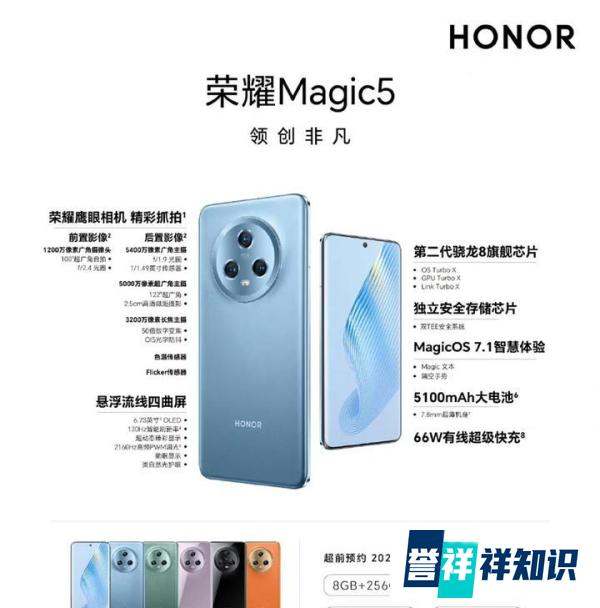 Magic 5:采用6.73英寸240Hz懸浮流線四曲護眼屏,支持2160Hz高頻PWM調光,搭載驍龍8 Gen 2處理器,內置5100mAh電池,支持66W快充,后置5400萬像素廣角主攝 + 3200萬像素長焦主攝 + 5000萬像素超廣角主攝,支持最高50倍數字變焦。