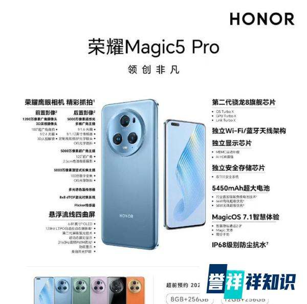 Magic5 Pro:采用6.8英寸120Hz(LTPO自適應動態刷新率)懸浮流線四曲護眼屏,后置5000萬像素廣角主攝 + 5000萬像素潛望式長焦主攝 + 5000萬像素超廣角主攝,最高支持100倍數字變焦,搭載驍龍8 Gen 2處理器,內置5450mAh大電池,支持66W有線快充和50W無線快充,有獨立Wi - Fi/藍牙天線結構加持,支持IP68級防水,新增鷹眼精彩抓拍捕捉功能。