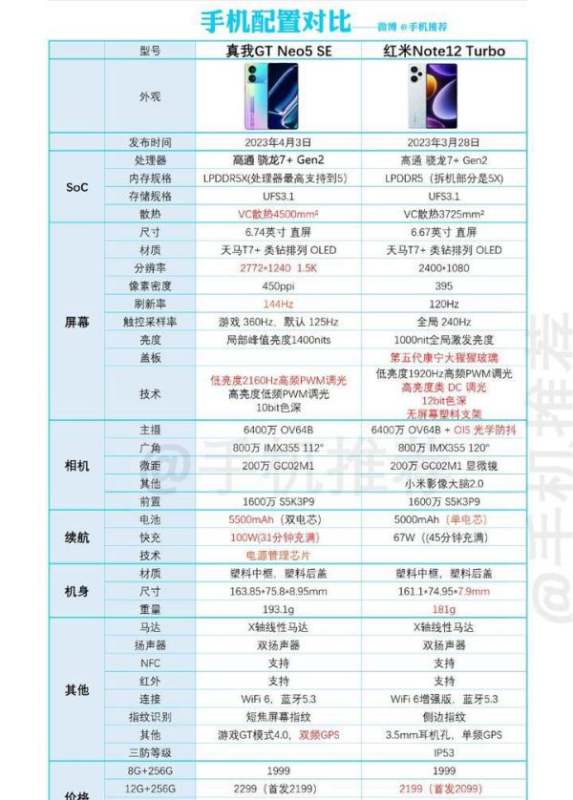 真我GT Neo5 SE與紅米Note 12 Turbo整體性價比均較高,真我GT Neo5 SE在屏幕精細(xì)度、充電功率上占優(yōu),紅米Note 12 Turbo在護(hù)眼效果、夜景拍攝、機身輕薄度及價格上更具優(yōu)勢。具體對比如下: