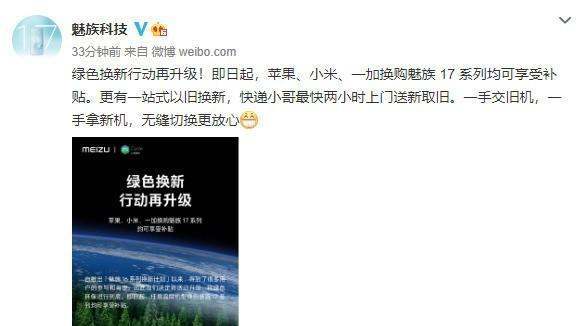 魅族綠色換新行動再升級,支持蘋果、小米等舊機型換購魅族17系列,并提供補貼及一站式服務,兼顧用戶福利與環(huán)保需求。