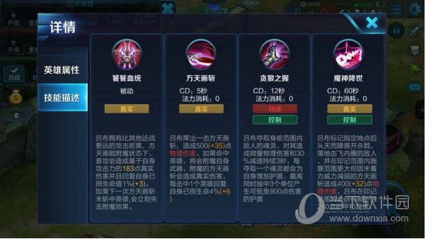 呂布的一技能命中敵人后,能附魔武器,使他的方天畫斬會造成真實傷害,一技能命中敵人后,還可以回復自身的生命值。大招有著超遠距離的攻擊距離,可以將范圍內所有敵人擊飛,是一個強大的控制技能。