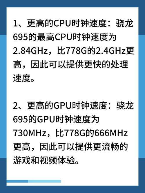 1、更高的CPU時鐘速度:驍龍695的最高CPU時鐘速度為2.84GHz,比778G的2.4GHz更高,因此可以提供更快的處理速度。
