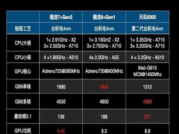 但是在GPU方面,天璣8300就真的是揚眉吐氣了。上一代的天璣8200,曼哈頓3.1跑分只有120FPS,功耗為6.04W,根本沒法和驍龍7+Gen2打。但是,天璣8300的曼哈頓3.1跑分,高達207FPS,同時功耗為8.9W——雖然峰值功耗對比天璣8200高了不少,但是性能、能效,都比驍龍8+Gen1略強一些,至于驍龍7+Gen2就更不必說了。