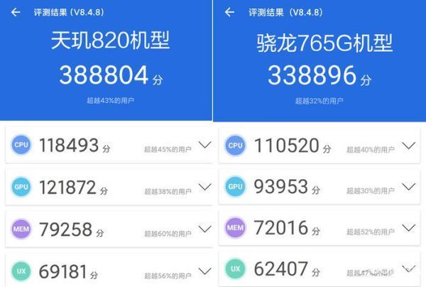8、聯發科天璣820處理器的跑分高達40W,雖然已經和驍龍865處理器的跑分差不很多,驍龍865處理器是配高端旗艦機型,天璣820處理器配中高端機型但價格天璣820處理器比驍龍865處理器低得多,性能差距還是有一點。