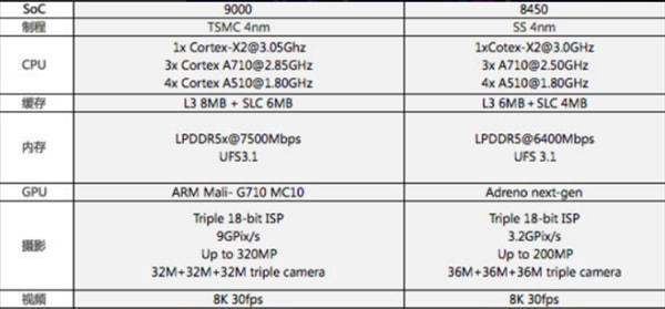 從已公布的參數(shù)對(duì)比圖來(lái)看,天璣9000和驍龍8 Gen1在各項(xiàng)參數(shù)上基本平分秋色,各有優(yōu)勢(shì)。