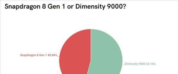 在Android Authority公布的一項(xiàng)統(tǒng)計(jì)中,針對(duì)1500名數(shù)碼愛(ài)好者的調(diào)查顯示,更喜歡天璣9000的網(wǎng)友占比54.16%,而喜歡驍龍8 Gen1的網(wǎng)友占比45.84%。這一結(jié)果清晰地表明,在受歡迎程度上,天璣9000略勝一籌。