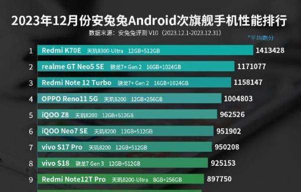 次旗艦性能榜排名:搭載天璣8300-Ultra的Redmi K70E在安兔兔12月安卓次旗艦手機性能榜中登頂第一,跑分呈現斷崖式領先優勢,明顯超越其他同級機型,坐實了“神U”之名。