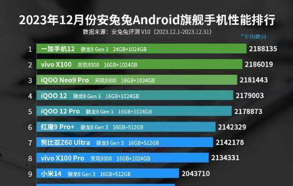 旗艦性能榜排名:在安兔兔12月安卓旗艦手機性能榜中,搭載天璣9300的vivo X100和iQOO Neo9 Pro兩款機型表現搶眼,超越眾多驍龍8 Gen 3機型,進入旗艦性能第一梯隊。榜單Top3中,天璣9300機型占據2席,且前三名跑分均為218萬,其中vivo X100和iQOO Neo9 Pro內存配置為16GB,并非24GB,因此天璣9300性能并列第一的結論合理。