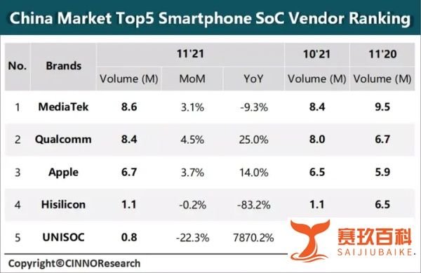 CINNO Research數(shù)據(jù)顯示,11月中國智能手機SoC市場中聯(lián)發(fā)科超越高通排名第一,蘋果增速放緩,市場格局呈現(xiàn)“兩超一強”競爭態(tài)勢。以下為詳細(xì)分析:
