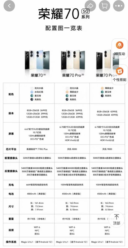 榮耀70Pro:8+256G版本3699元、12+256G版本3999元。
