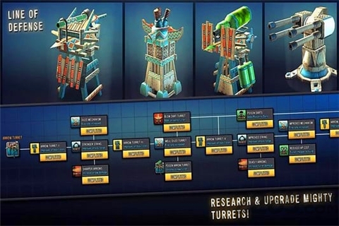 3、12層不同的塔樓為您塔防御,每一個獨特的研究樹,使之更加強大!用箭塔中的箭刺穿僵尸,用研缽炸彈將它們炸成碎片,或用特斯拉線圈使它們通電。