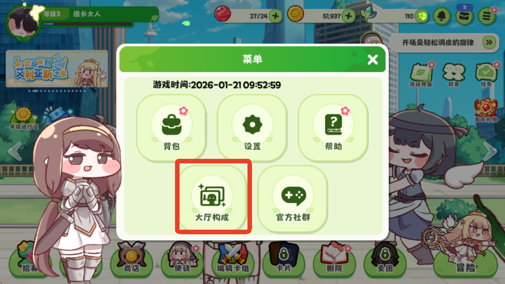 2、進入菜單頁面后點擊第二行第一個的【大廳構成】功能。