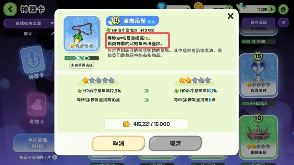 配置上限:您最少可攜帶 20張神器卡 與 15張奇物卡 進入某個模式的備選池。